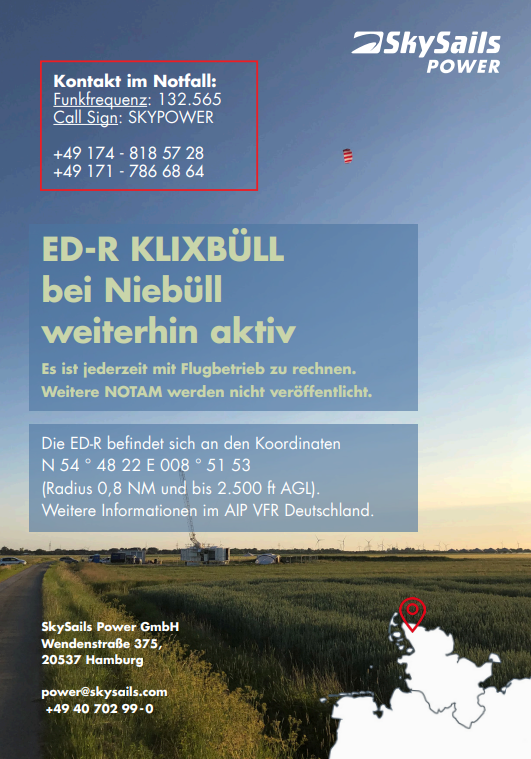 Näheres findet sich in dieser Bekanntmachung. Zur Information der Piloten (und zum Aushang am Schwarzen Brett/in der Flugleitung) hat der Betreiber SKYSAILS dieses Informationsblatt herausgegeben.